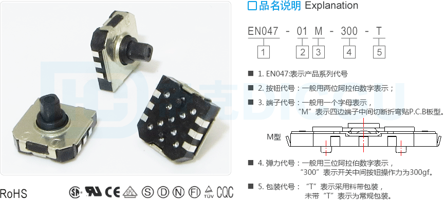 4. 弹力代号:一般用三位阿拉伯数字表示,“300”表示开关中间按钮操作力为300gf。