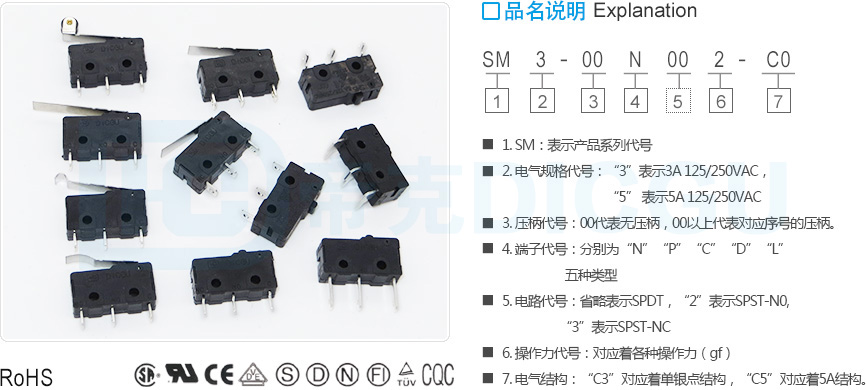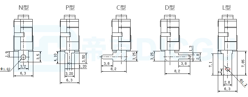 | 外形尺寸:19.8X10.6X6.3 | 电气规格:3A125VAC / 250VAC; 5A125VAC / 250VAC | 接触电阻(CR):≤100mΩ |