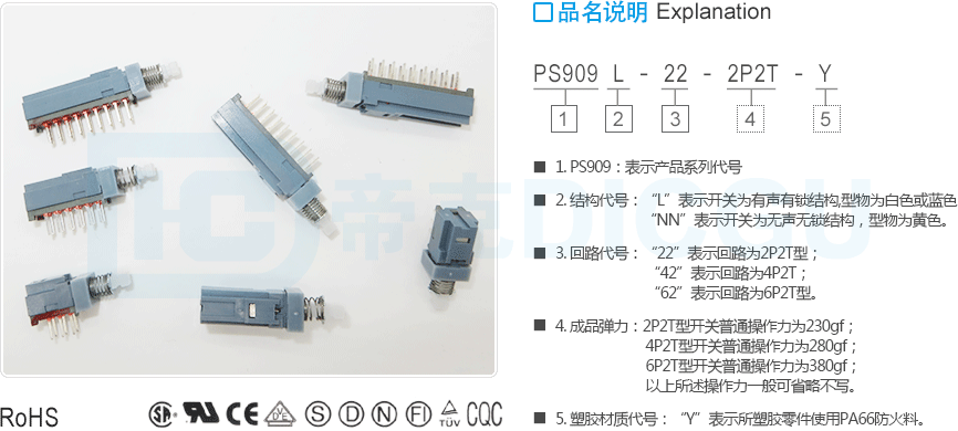 4. 成品弹力:2P2T型开关普通操作力为230gf;4P2T型开关普通操作力为280gf;6P2T型开关普通操作力为380gf;以上所述操作力一般可省略不写。