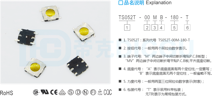 | 外形尺寸:5.2 * 5.2 * 0.85 | TS016电气规格:50mA 12VDC | 接触电阻(CR):≤100mΩ |