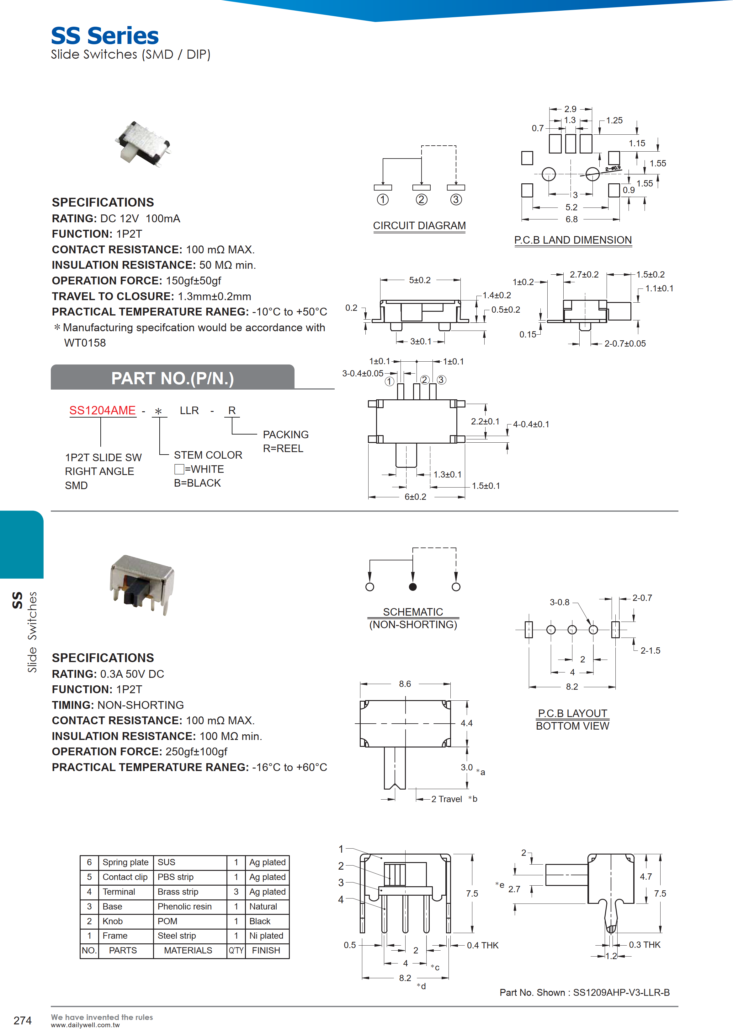 | 1 | SS1204AME-LLR-R | 1P2T | ON-ON | 100mA,12VDC | 1.5mm | - | 1.3mm | -10°C ~ 50°C |