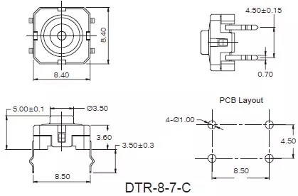 Dustproof construction with dimension 8.4 x 8.4 mm. The feature is a unique click and a sealed contact system. Silicon rubber button used in this switch with great hand feeling. This series has a large stroke to let the user has a better feel and prevents misoperation. Besides, the switch is matched with different caps and different operation forces.