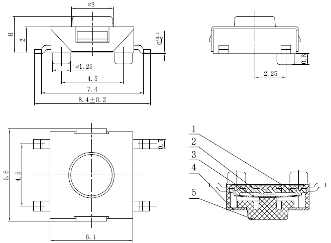 产品规格:6×6×H/H=2.5/2.7/3.0/3.1/3.4/3.7/3.8/4.3/5/5.5mm