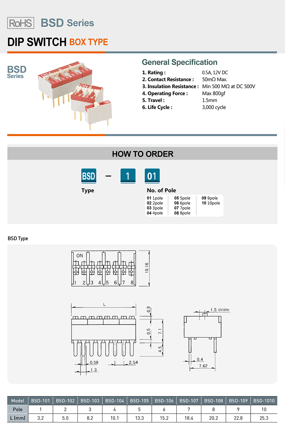| 1 | BSD-101 | 滑动式 | 凸型 | 顶部 | 12VDC/500mA | 1P | DIP | 2.54mm | 常规式 | 管装 | |
