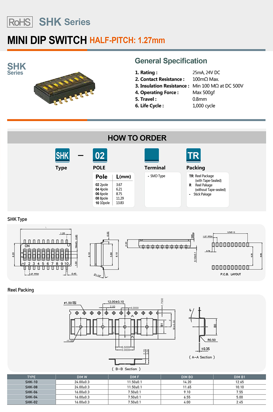 | 4 | SHK-04TR | 滑动式 | 平型 | 顶部 | 24VDC/25mA | 4P | SMT | 1.27mm | 顶部胶带 | 卷带 | |