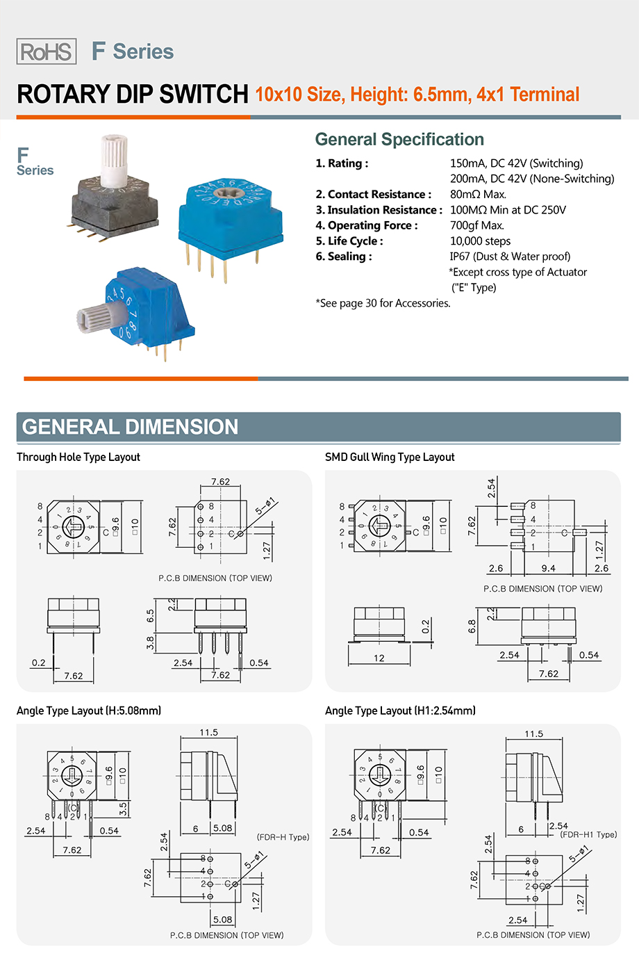 | 7 | FDR-06S | 旋转式 | 平型 | 顶部 | 10*10mm | 实码 | 42mA/150mA | 6P | 4*1 | SMT | 2.54mm | 管装 | 50pcs |