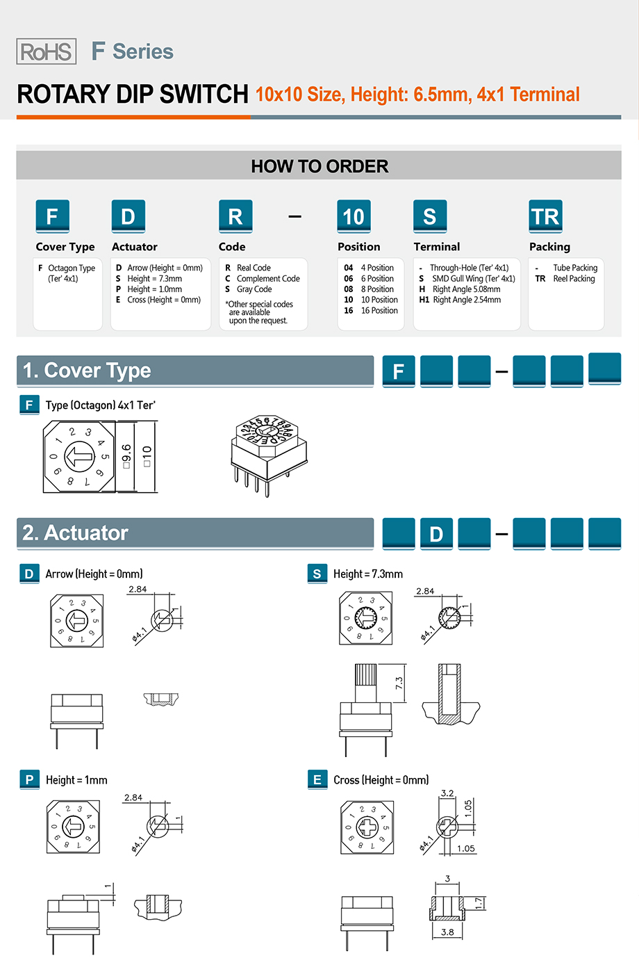 | 2 | FDR-04S | 旋转式 | 平型 | 顶部 | 10*10mm | 实码 | 42mA/150mA | 4P | 4*1 | SMT | 2.54mm | 管装 | 50pcs |