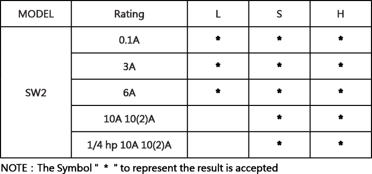 SPECIFICATIONS Operating frequency(mechanical): 120 Operation / mim Operating frequency(electrical): 10~30 Operation / mim Contact resistance: 300m Ω(max) Insulation resistance(at 500 VDC) 100M Ω(Min) Service life(mechanical) Min.200,000 Operations Service life(electrical) Min.10,000 Operations