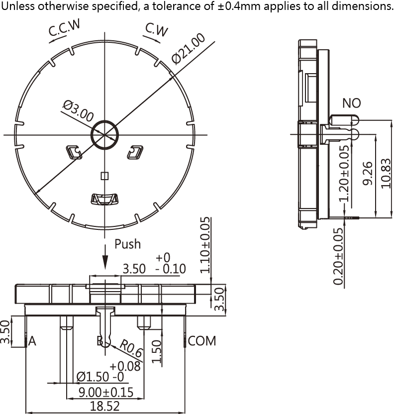 SPECIFICATIONS Operating force: Push-220±40 gf Operation / mim Operating frequency(electrical): Push-120 Operation / mim Contact resistance: 300m Ω(max) Service life(electrical) Push-Min. 1,000,000 Operations
