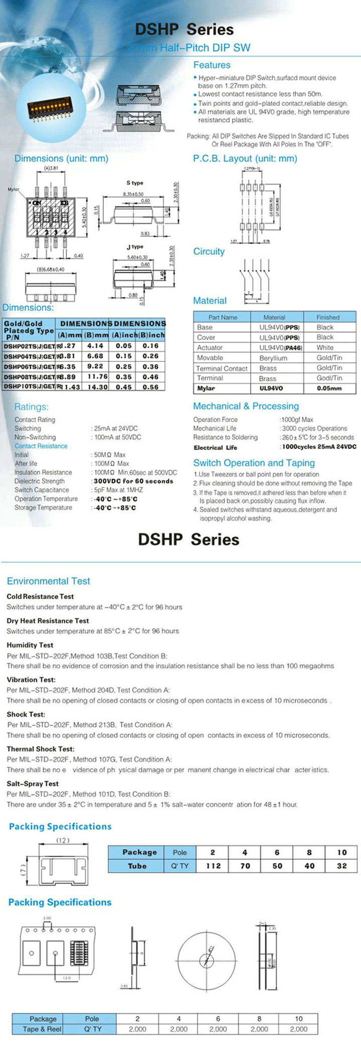 | 10 | DSHP10TJGET | 滑动式 | 平型 | 顶部 | 24VDC/25mA | 10P | SMT | 1.27mm | 顶部胶带 | 管装 | 32pcs |